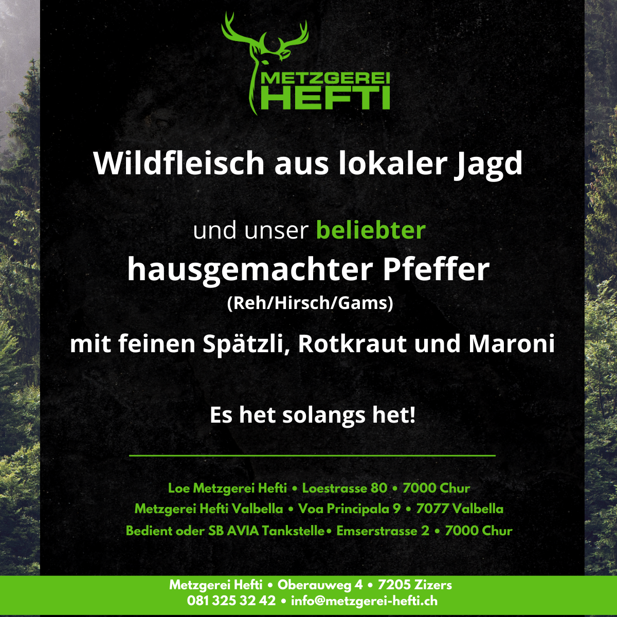 Die Wildsaison ist eröffnet! Feine Wildgerichte wie Pfeffer, Spätzli, Rotkraut mit Maroni und feines Wildfleisch sind in unserer Metzgerei und unseren Läden erhältlich.