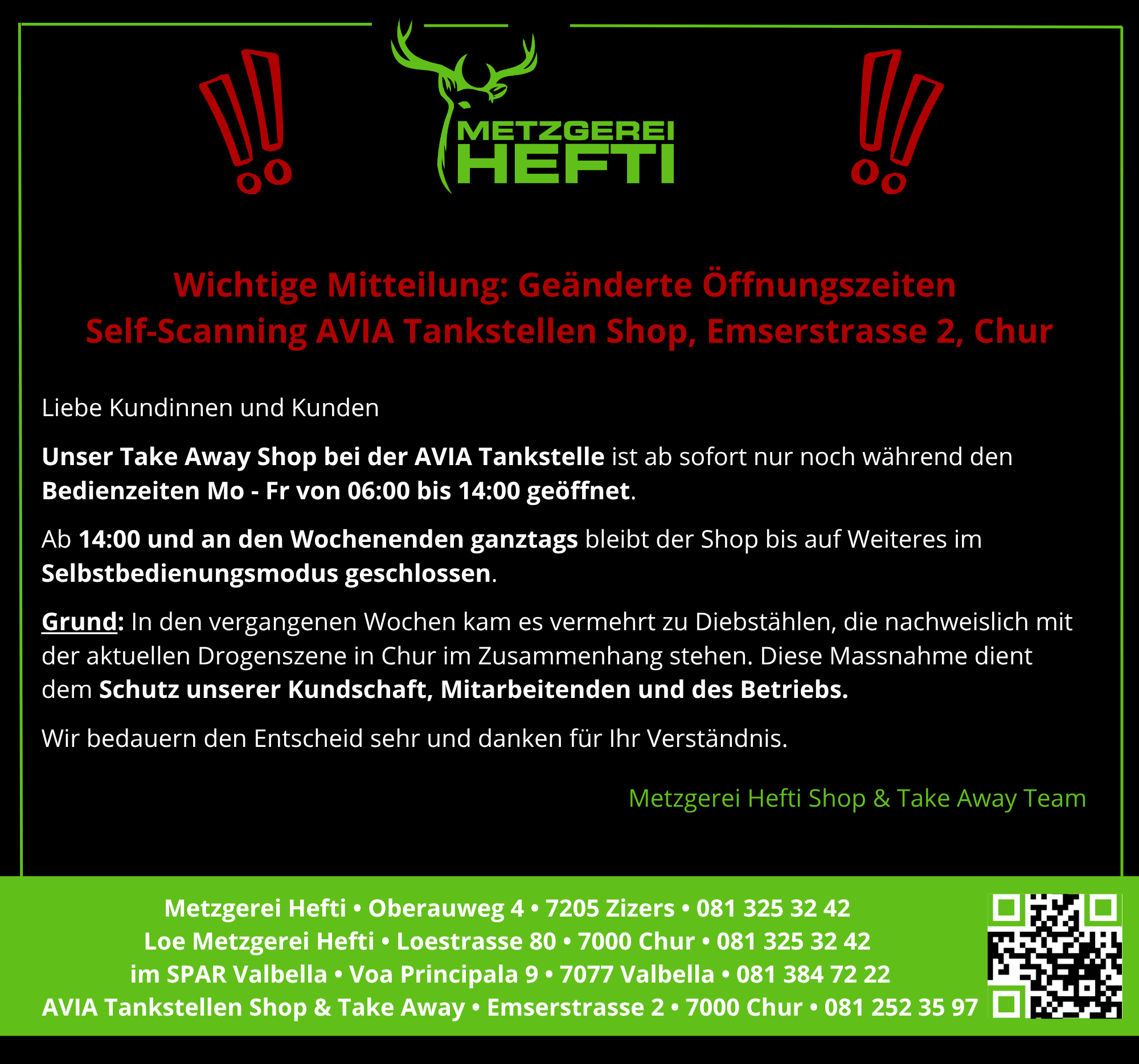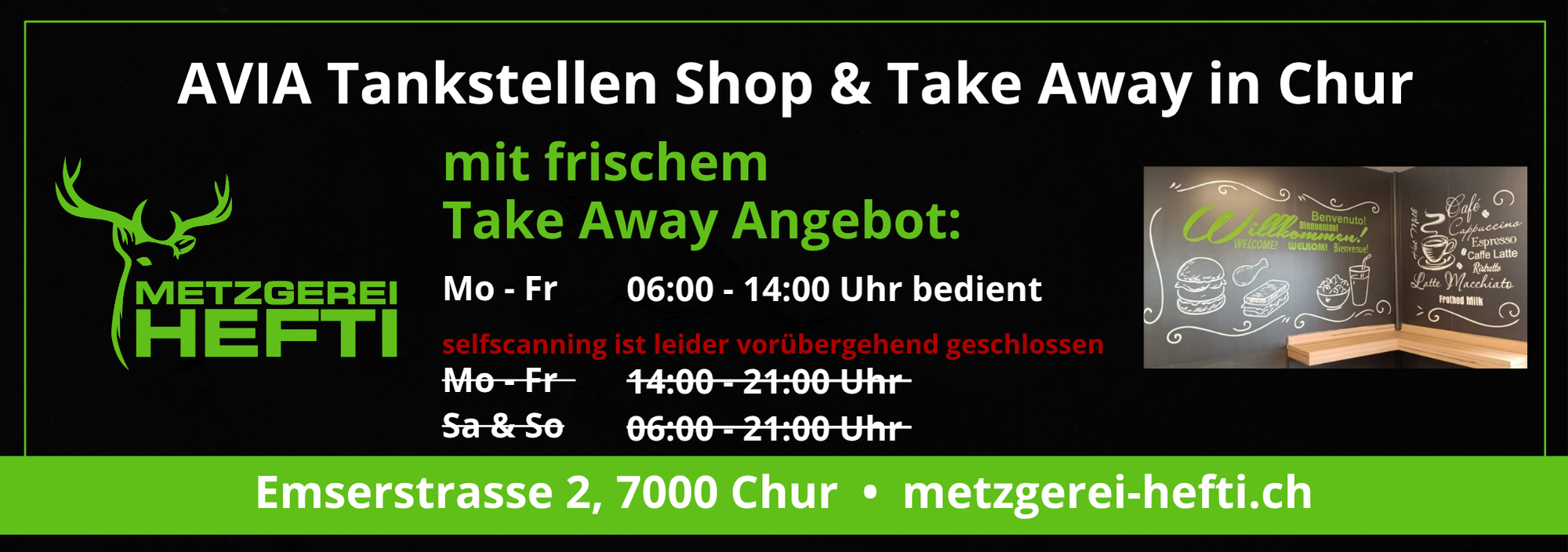 Per 21. September 2025: Änderung der Öffnungszeiten, Shop & Take Away, Self-Scanning, AVIA Tankstelle, Chur